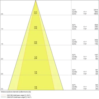 Der Abstrahlwinkel bezeichnet den Winkel, in dem das Licht aus der Lichtquelle ausgestrahlt wird. Er wird in Grad (D) angegeben. Je geringer die Gradzahl des Abstrahlwinkels ist, desto kleiner ist auch der Durchmesser des Lichtkegels, den die Lichtquelle produziert.