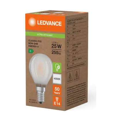 Cette ampoule rétro Ledvance LED Classic E14 Poire Filament Dépolie 1.2W 255lm - 840 | Remplacement 25W est l’alternative idéale pour la remplacement de votre ampoule classique de 25 W. La technologie LED intégrée vous offrira de nombreux avantages. Les ampoules à incandescence traditionnelles ont une durée de vie limitée. Cette alternative LED vous permettra de profiter d’un éclairage durable et fiable.