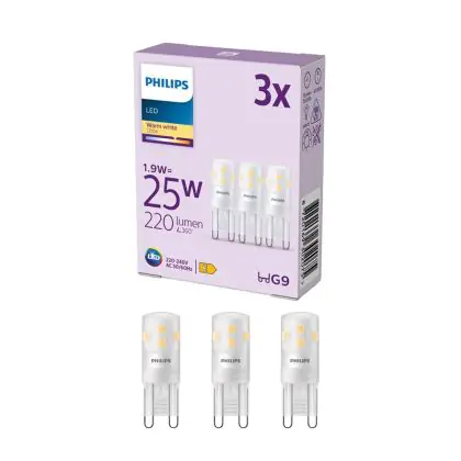 Les ampoules LED G9 sont des petites ampoules en forme de capsule. Ces ampoules vous permettront de remplacer vos ampoules à incandescence et à économies d’énergie sans modification de votre installation actuelle. Cette ampoule Lot 3x Philips LED Capsule G9 Dépolie 1.9W 220lm - 827 est la variante à LED de l’ampoule G9 classique. Cette ampoule Philips se caractérise par sa faible consommation d’énergie. Elle n’utilise que 1.9 W, pour fournir une lumière de haute qualité. Cette ampoule LED est produite par Philips, une marque réputée en matière d'éclairage. Vous êtes donc assuré de sa qualité.